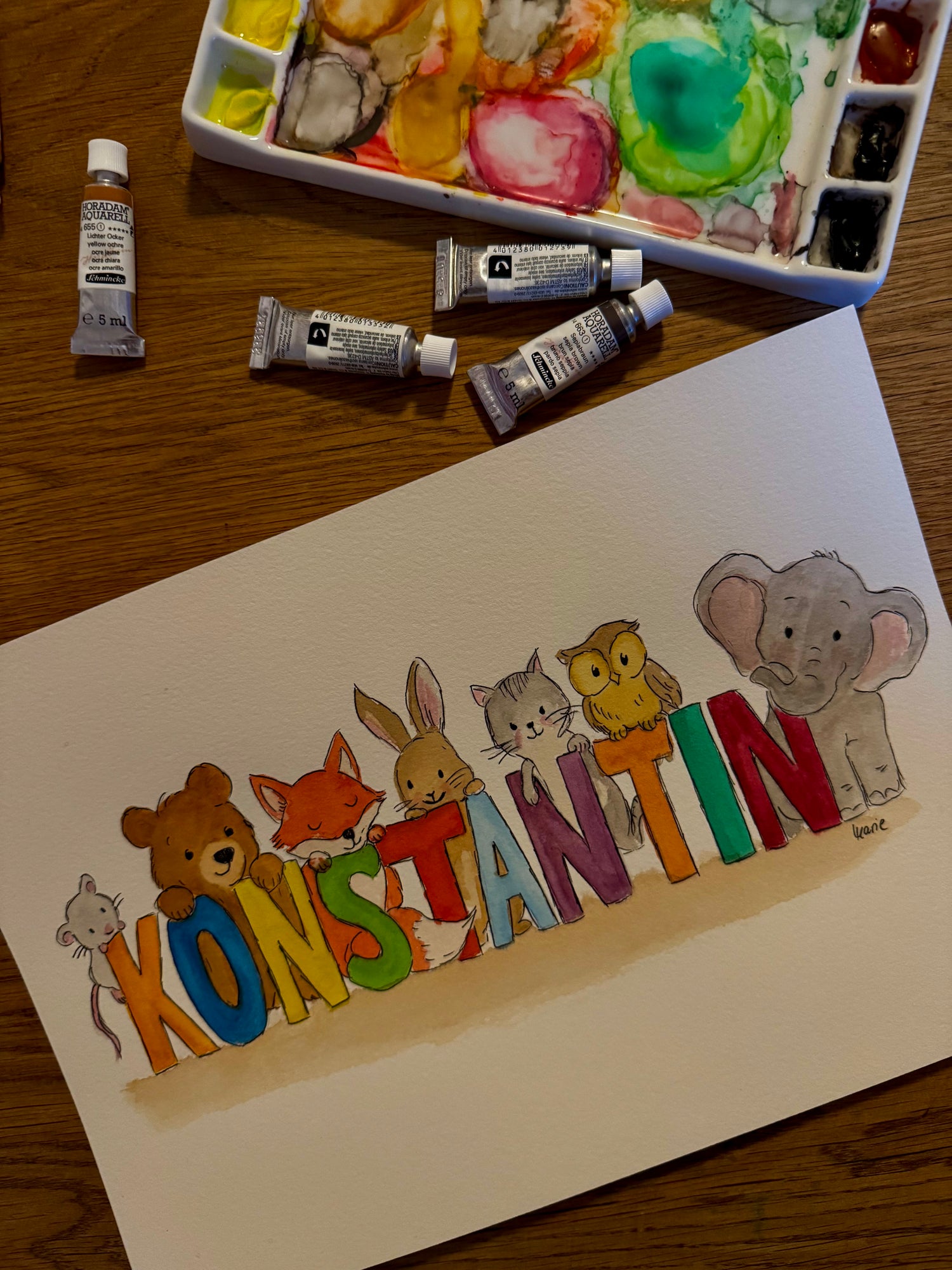 Zur Geburt, Taufe oder als Geschenk fürs Kinderzimmer: Ich male individuelle Aquarellbilder mit Namen, Tieren oder Motiven deiner Wahl.