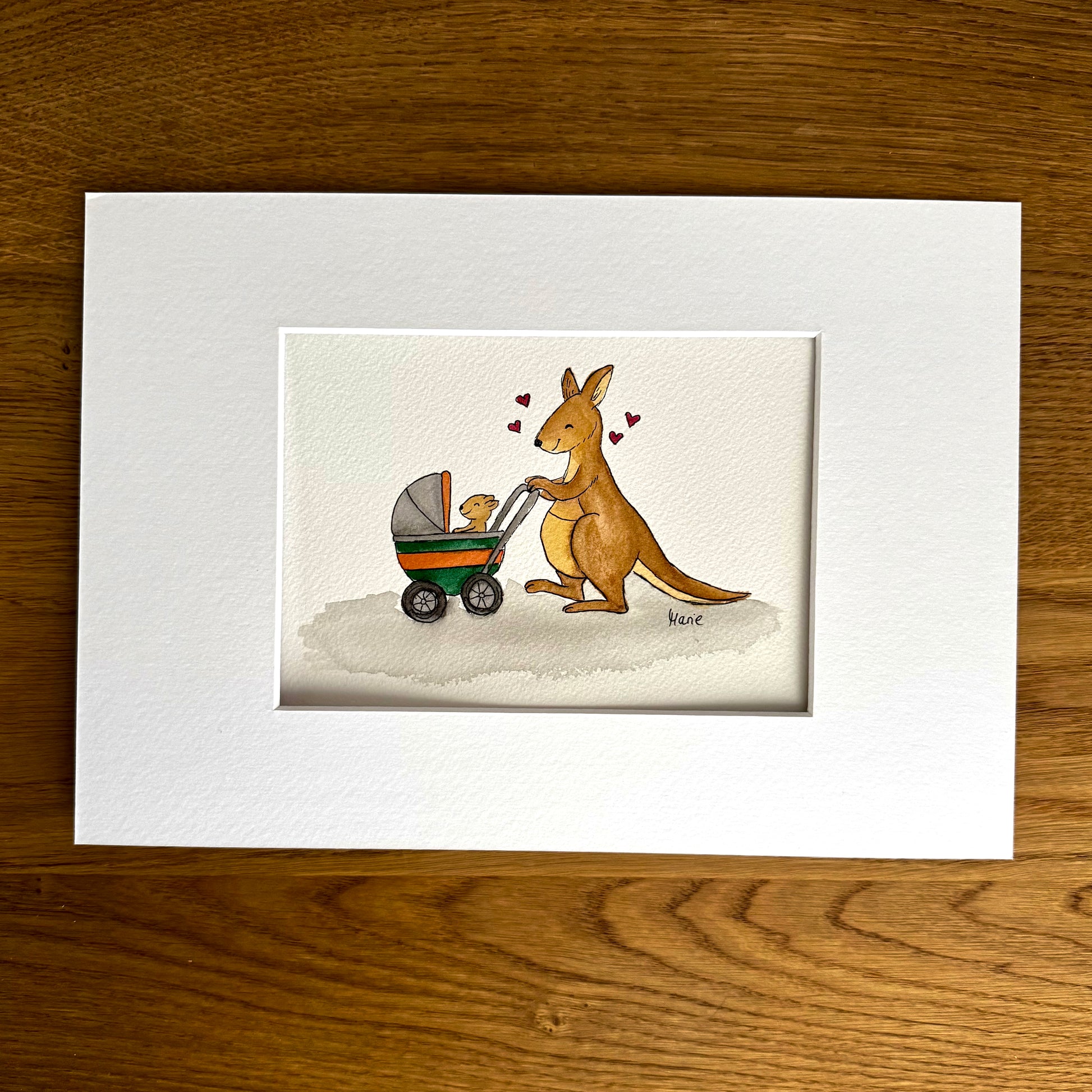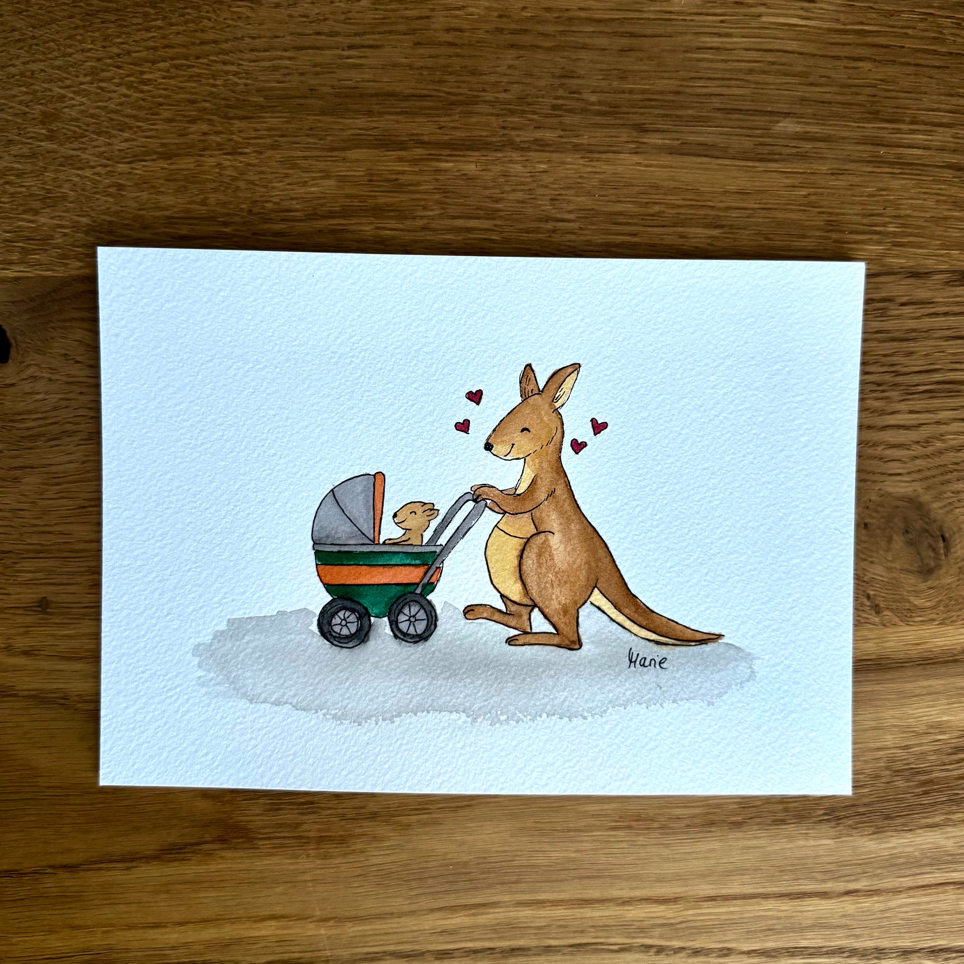 Dieses Original-Aquarell zeigt ein Känguru, das liebevoll den Kinderwagen mit seinem kleinen Joey schiebt. Zärtlich, stolz und rundum glücklich – eine Hommage an all die großen und kleinen Momente der Fürsorge.