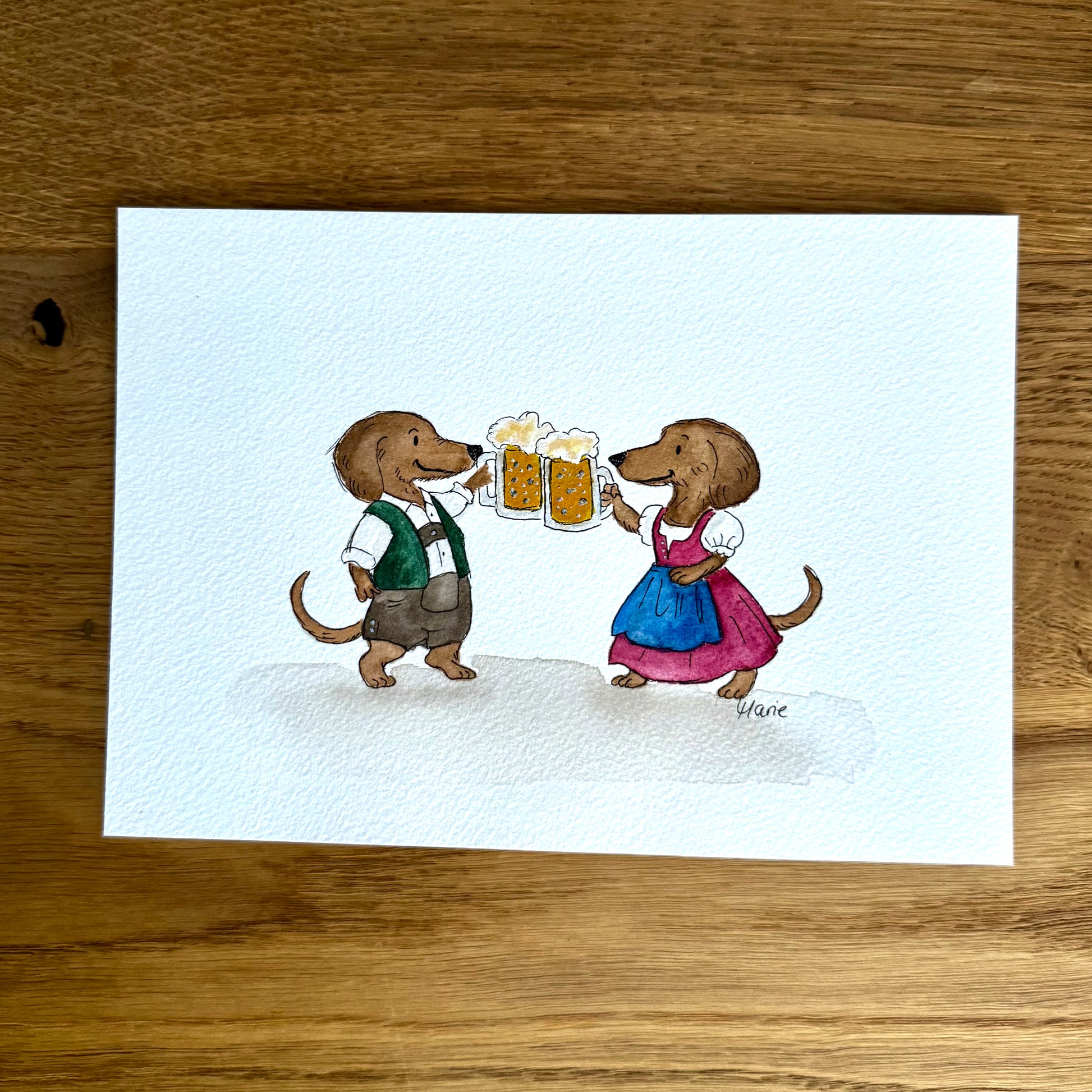 Dieses Original-Aquarell zeigt zwei Dackel in Tracht, die fröhlich mit Maßkrügen anstoßen. Er in Lederhose, sie im Dirndl – ein kleines Festmoment voller Charme, Gemütlichkeit und guter Laune.