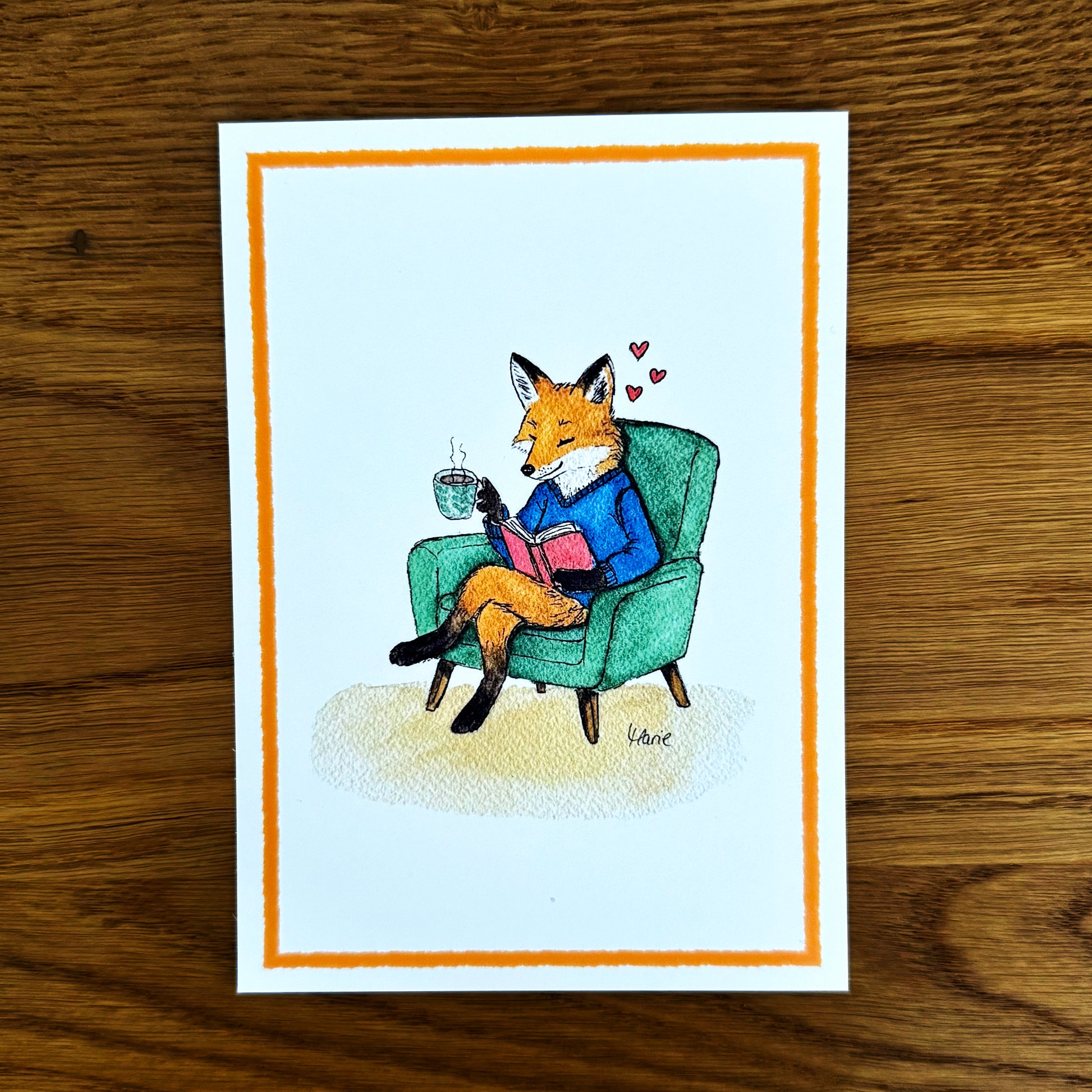 Diese Karte fängt einen dieser stillen, goldenen Augenblicke ein, in denen alles passt – ein Fuchs, ein Tee und eine Geschichte, die man nicht mehr aus der Hand legt.