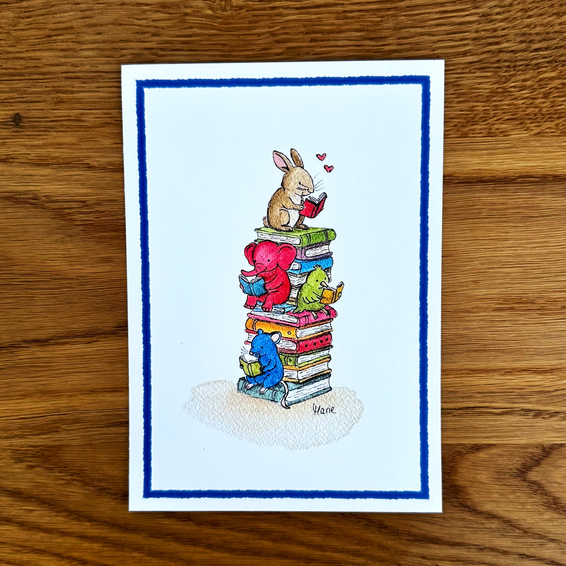 Diese Karte zeigt, wie schön es ist, in Geschichten zu versinken: oben, unten, nebendran, mittendrin. Wer hier liest, ist ganz bei sich – egal ob Maus, Elefant oder Hase.