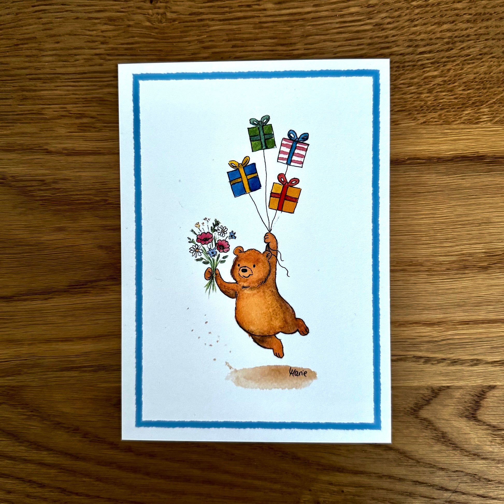 Ein Bär mit Blumenstrauß, vier Geschenken und ganz viel Schwung – unterwegs zu jemandem, der gefeiert werden will.