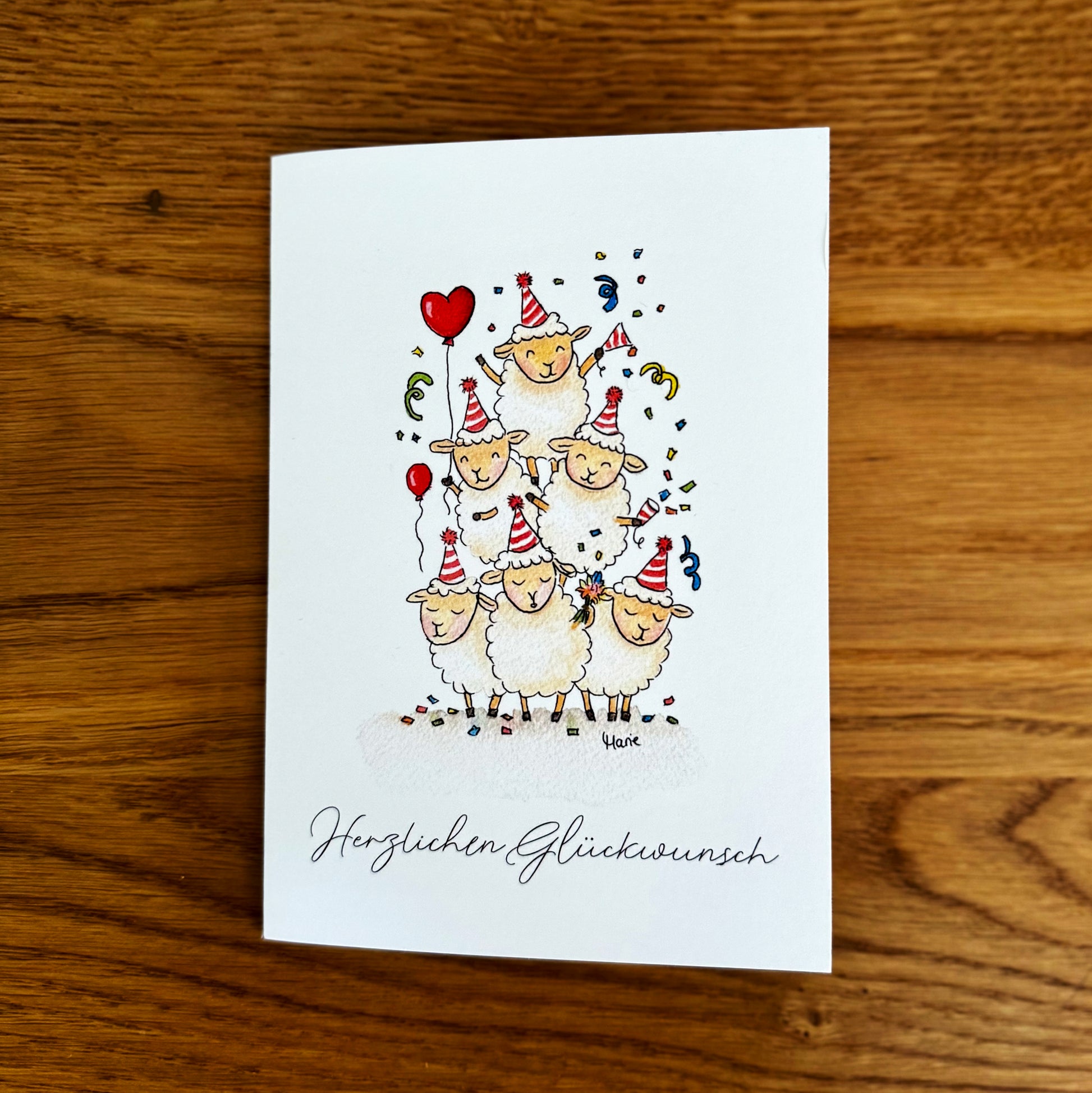 Eine Schafspyramide, sechs Partyhüte, Konfetti in der Luft – und mittendrin: ein Grund zum Feiern.