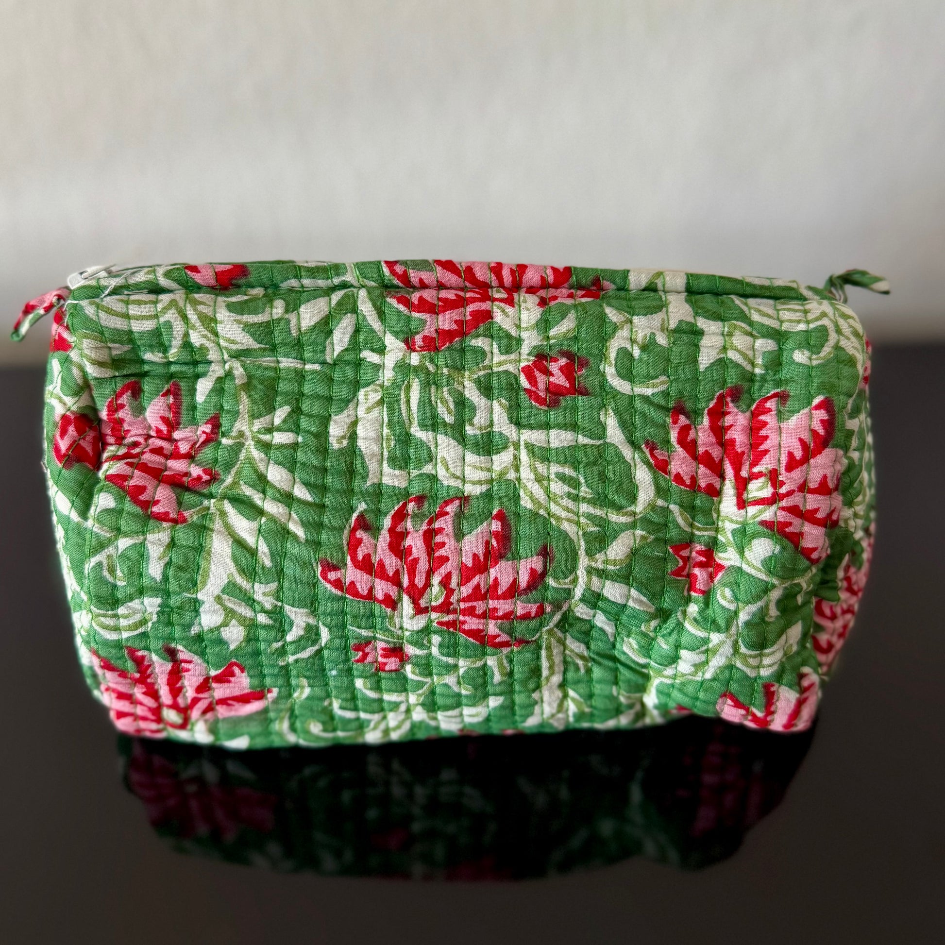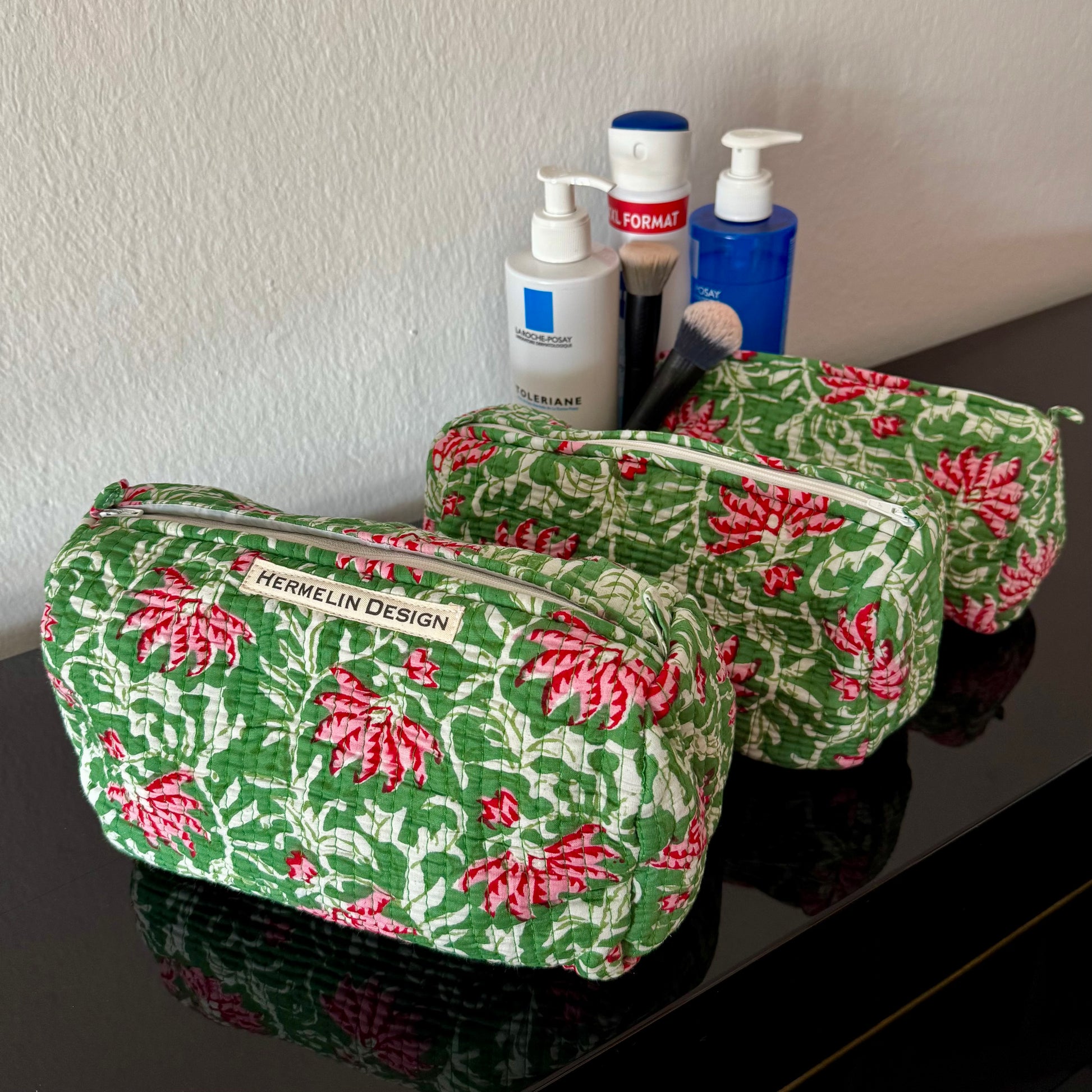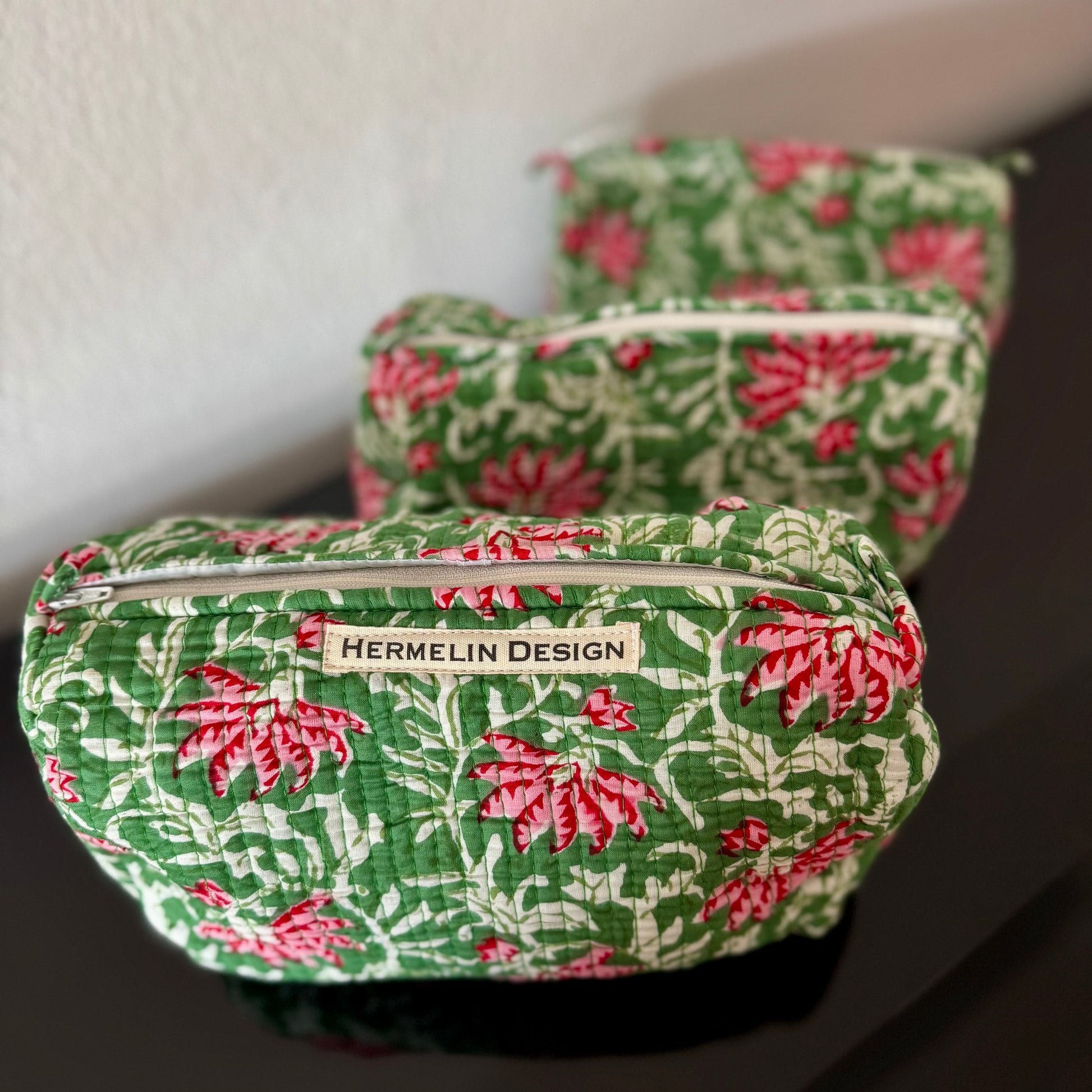 Ein Hauch botanischer Opulenz für unterwegs. Das Muster aus pinken Blüten auf tiefgrünem Grund wird in traditioneller Handarbeit auf Stoff gedruckt - lebendig, detailreich und trotzdem ruhig in seiner Wirkung. Die gesteppte Verarbeitung macht die Taschen stabil, weich und angenehm in der Hand. Das beschichtete Innenfutter schützt zuverlässig vor auslaufenden Flüssigkeiten - ideal für Kosmetik, Reisezubehör oder alles, was sicher verstaut sein soll.