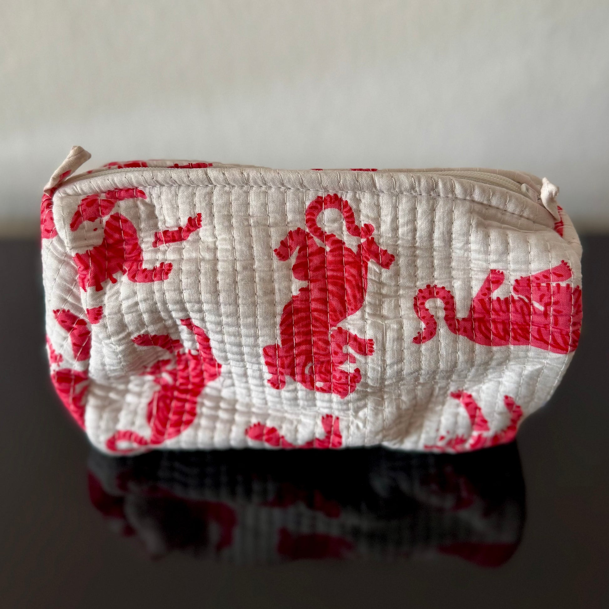 Ein bisschen wild darf’s sein: Dieser Kulturbeutel bringt Charakter ins Gepäck. Das rot-pinke Muster zeigt kleine Tiger in Bewegung – lebendig, verspielt und handbedruckt auf weichem Stoff. Innen ist der Beutel weich gefüttert, außen robust und leicht zugleich.