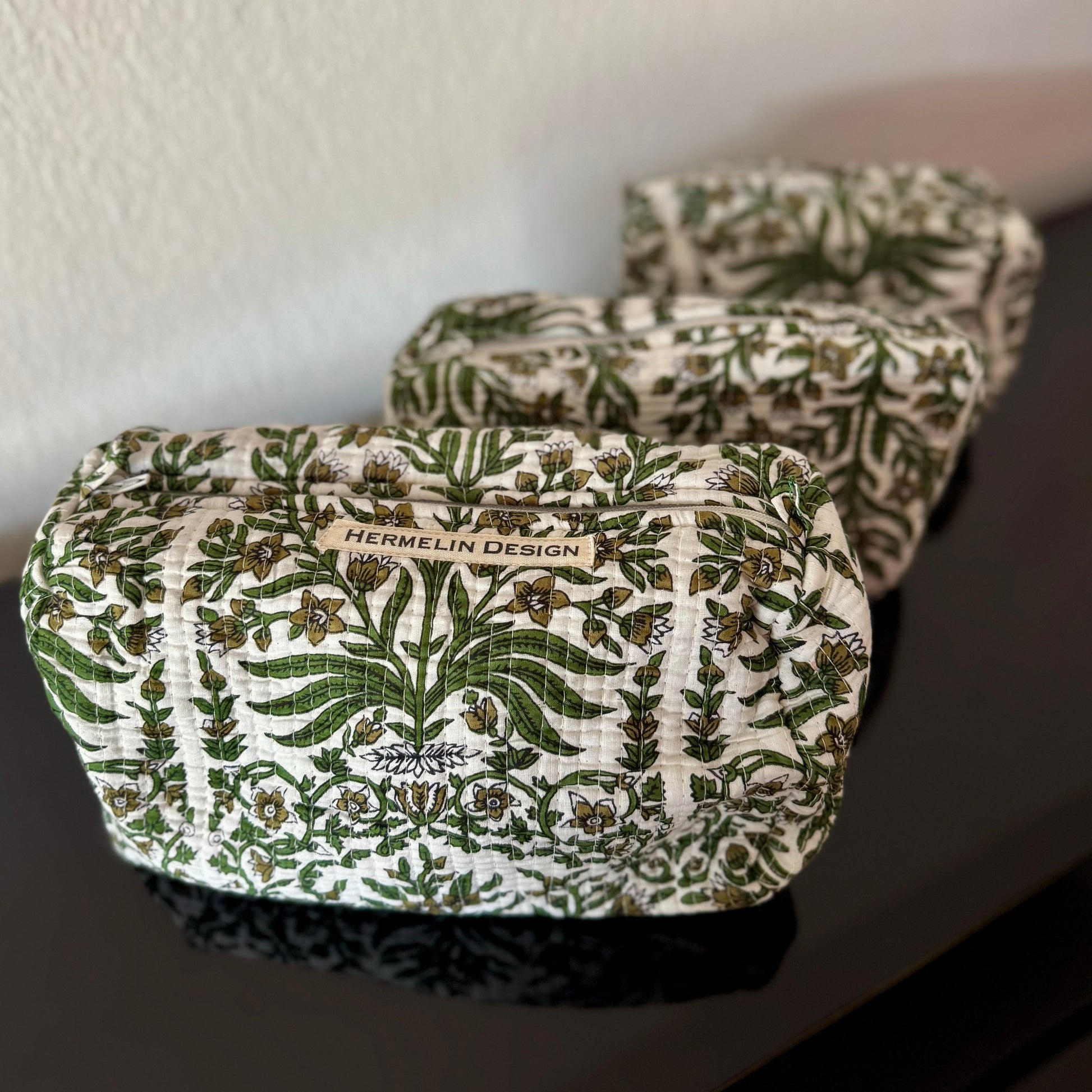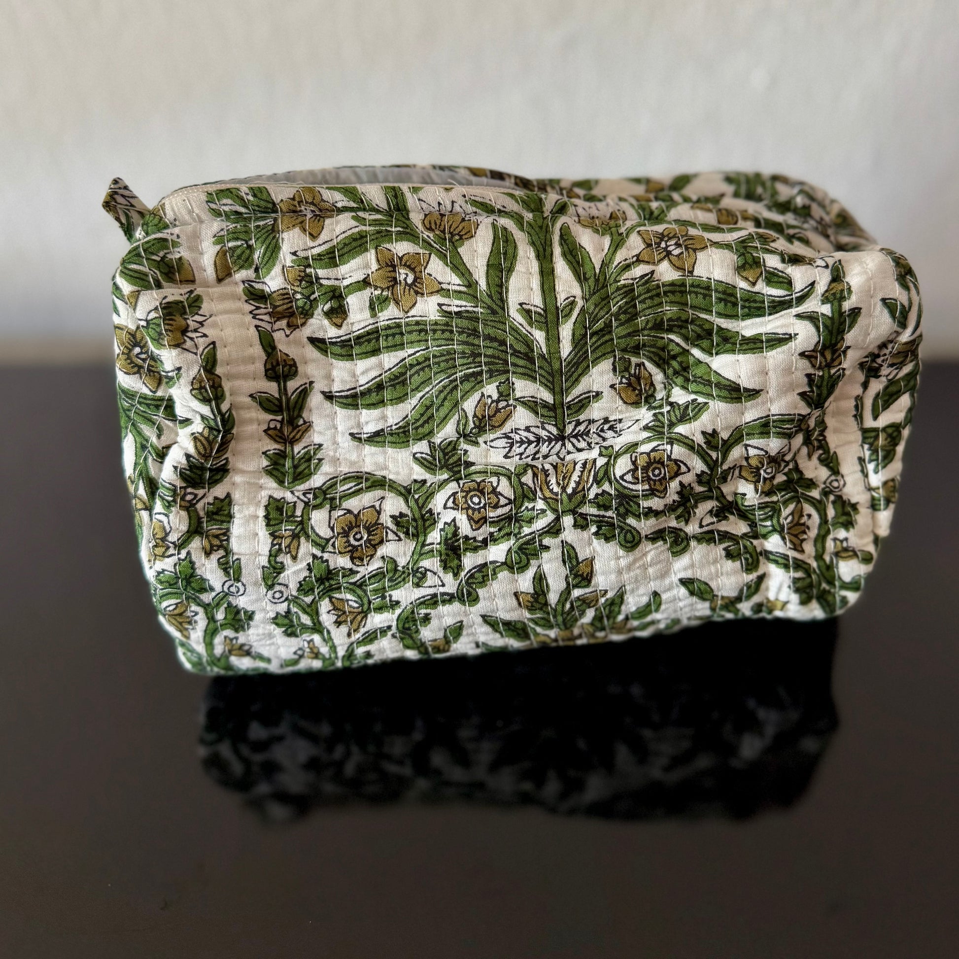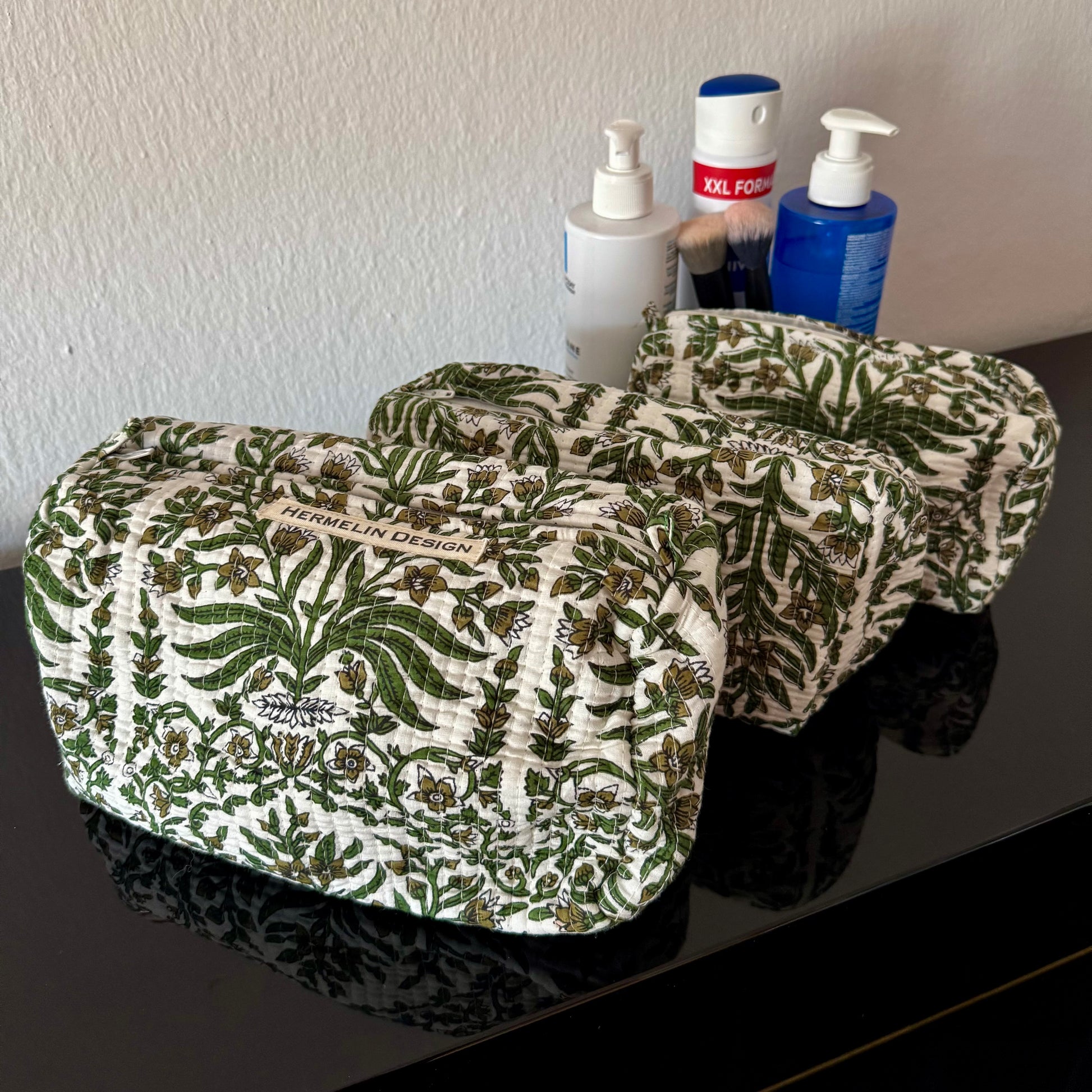 Diese Kulturbeutel bringen natürliche Klarheit ins Reisegepäck. Das detailreiche Blättermuster in kräftigem Grün wird traditionell in Indien von Hand auf Stoff gedruckt – jeder Beutel ist ein kleines Unikat. Die gesteppte Verarbeitung sorgt für Stabilität, die weiche Fütterung schützt alles, was du unterwegs brauchst.