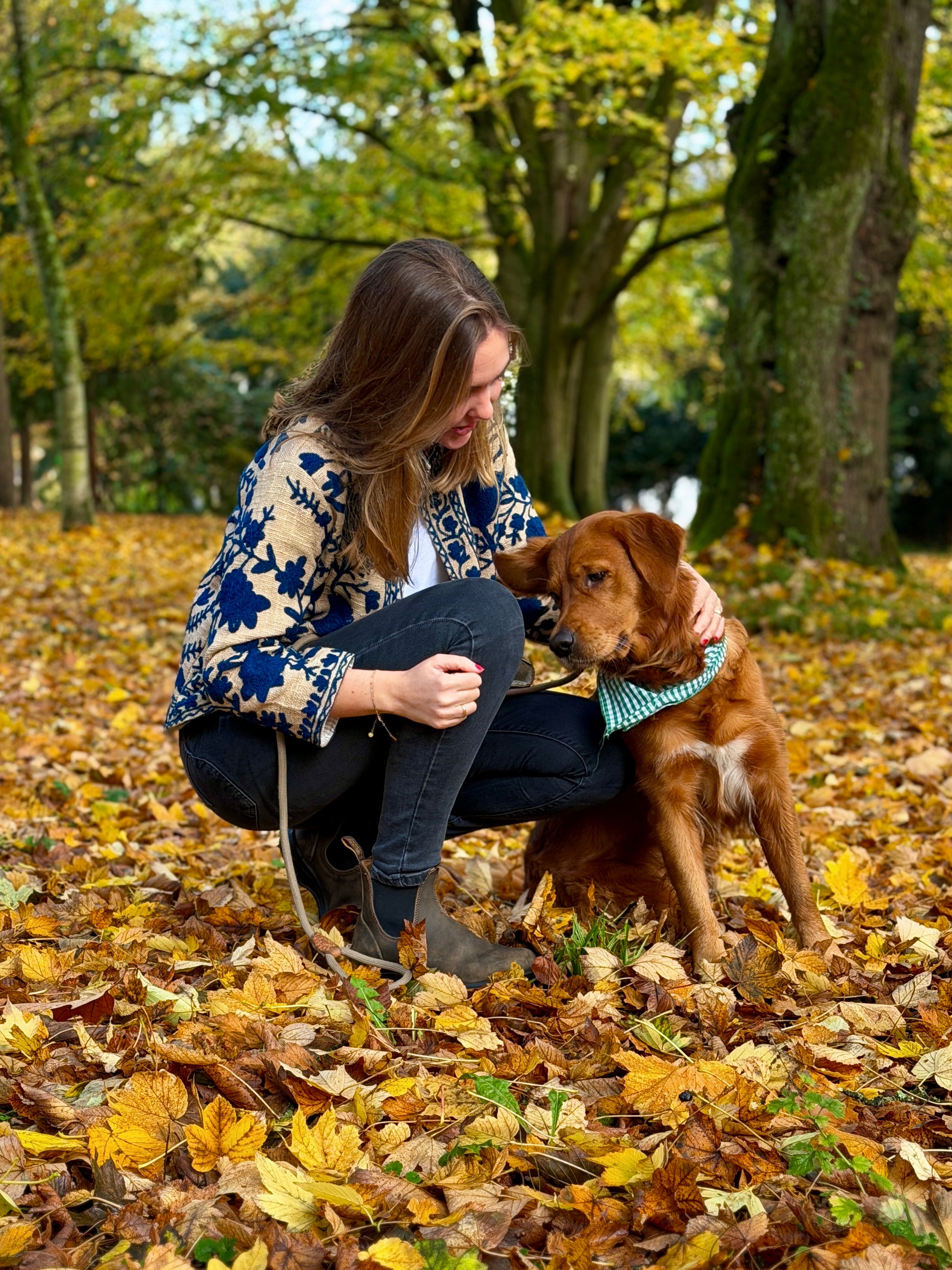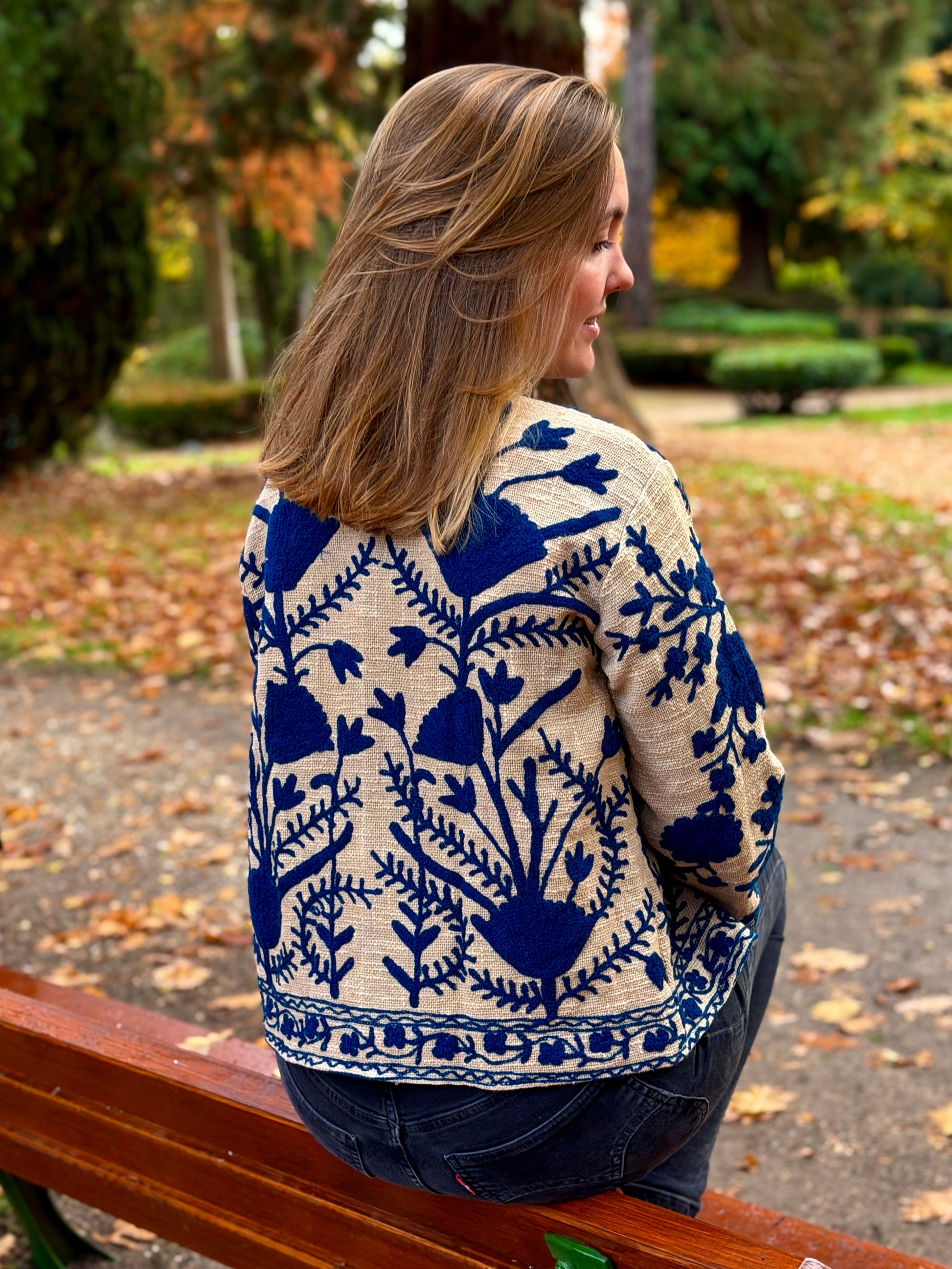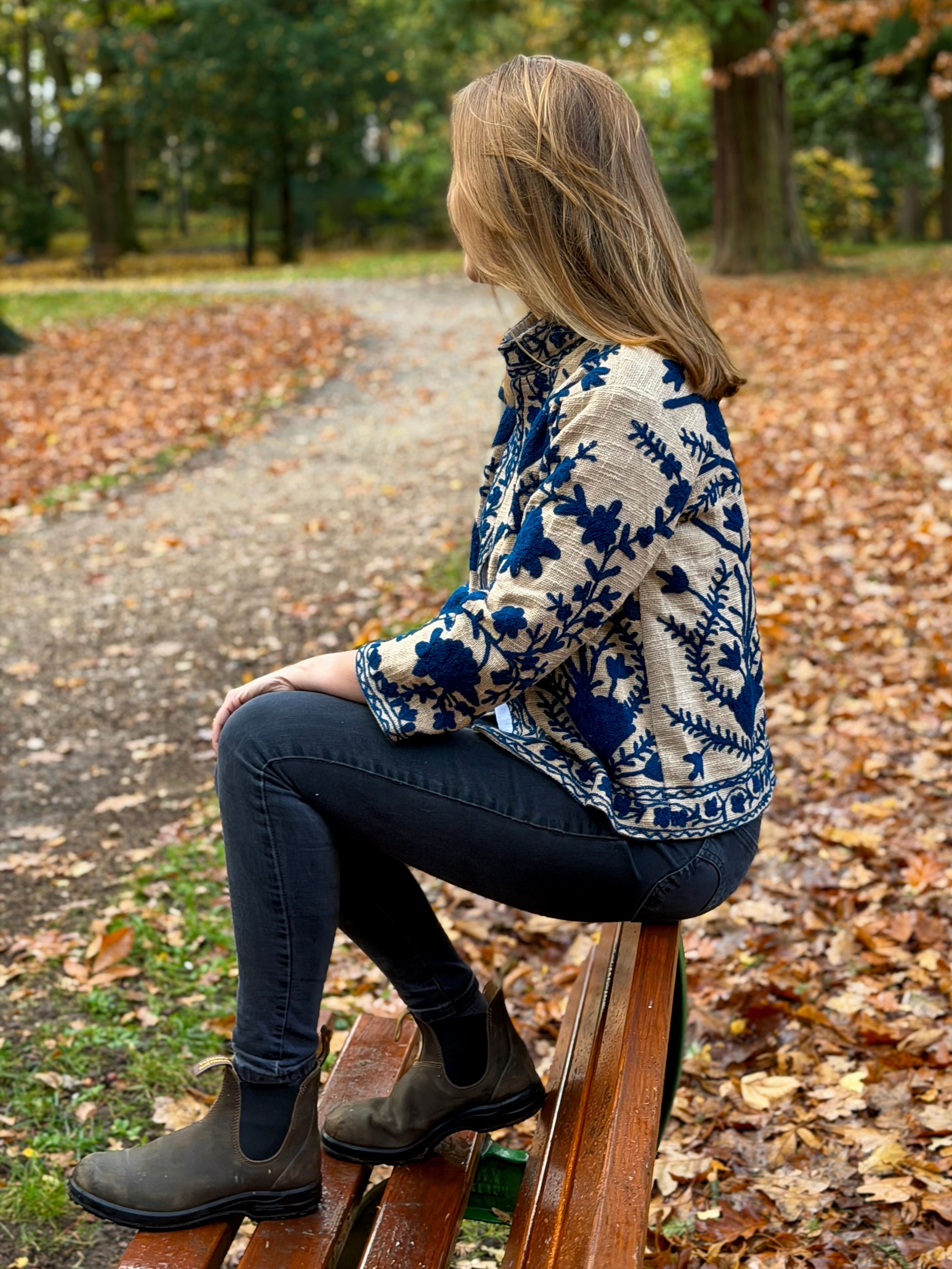 Die Kombination aus naturfarbenem Grundstoff und floraler Stickerei in tiefem Petrol macht diese Jacke besonders – grafisch und handwerklich zugleich. Sie wirkt zurückhaltend, aber nicht unauffällig.