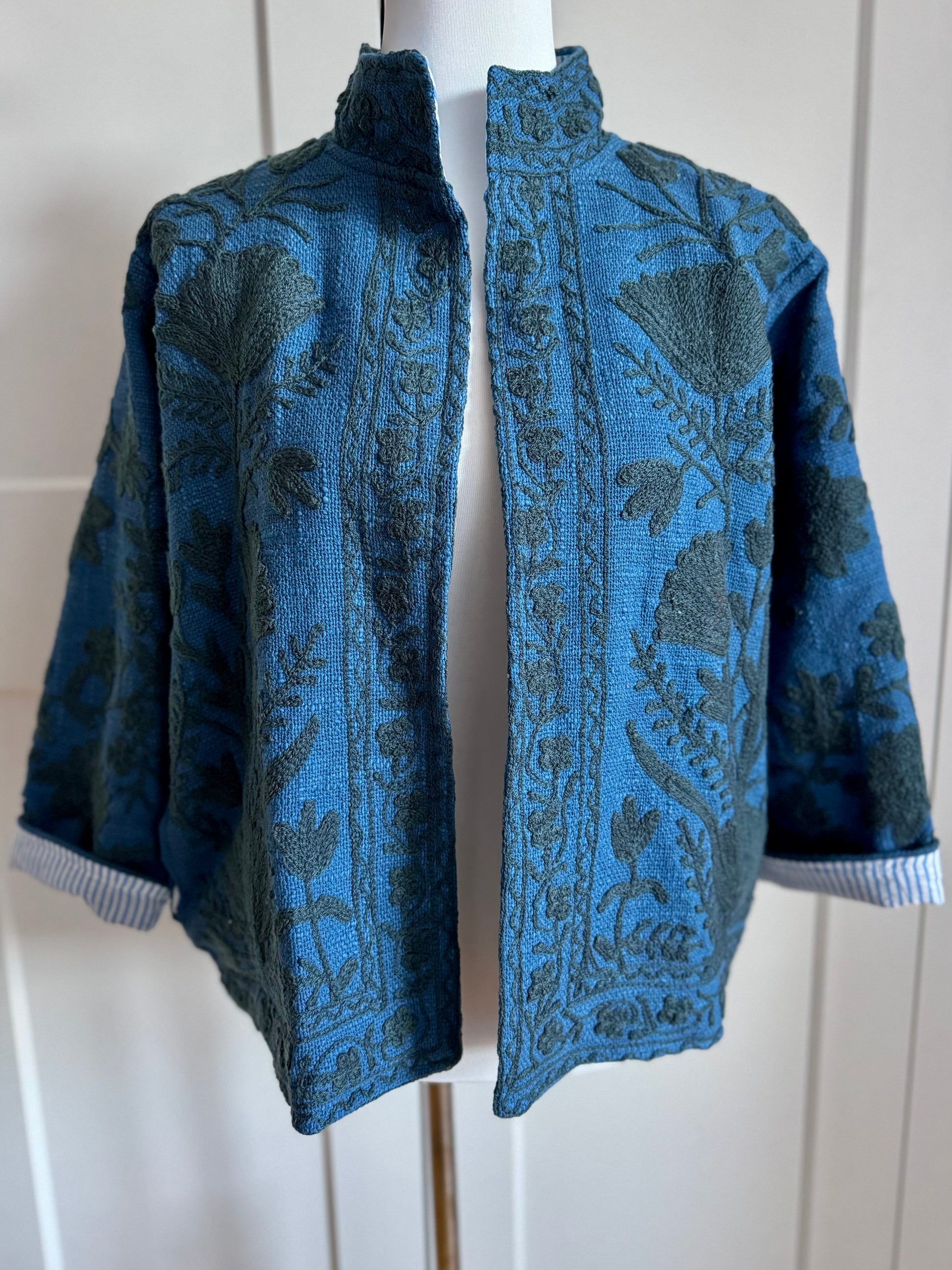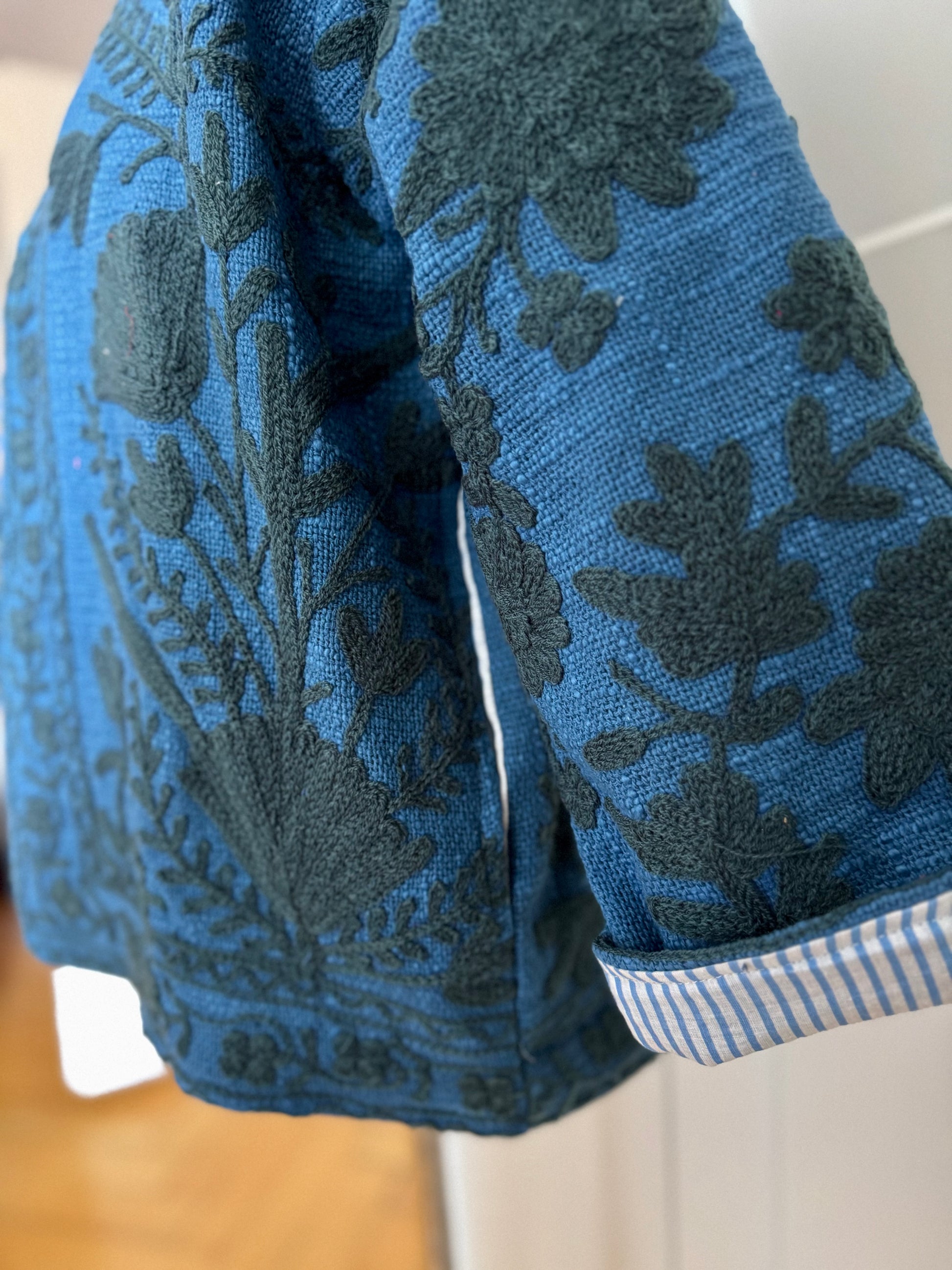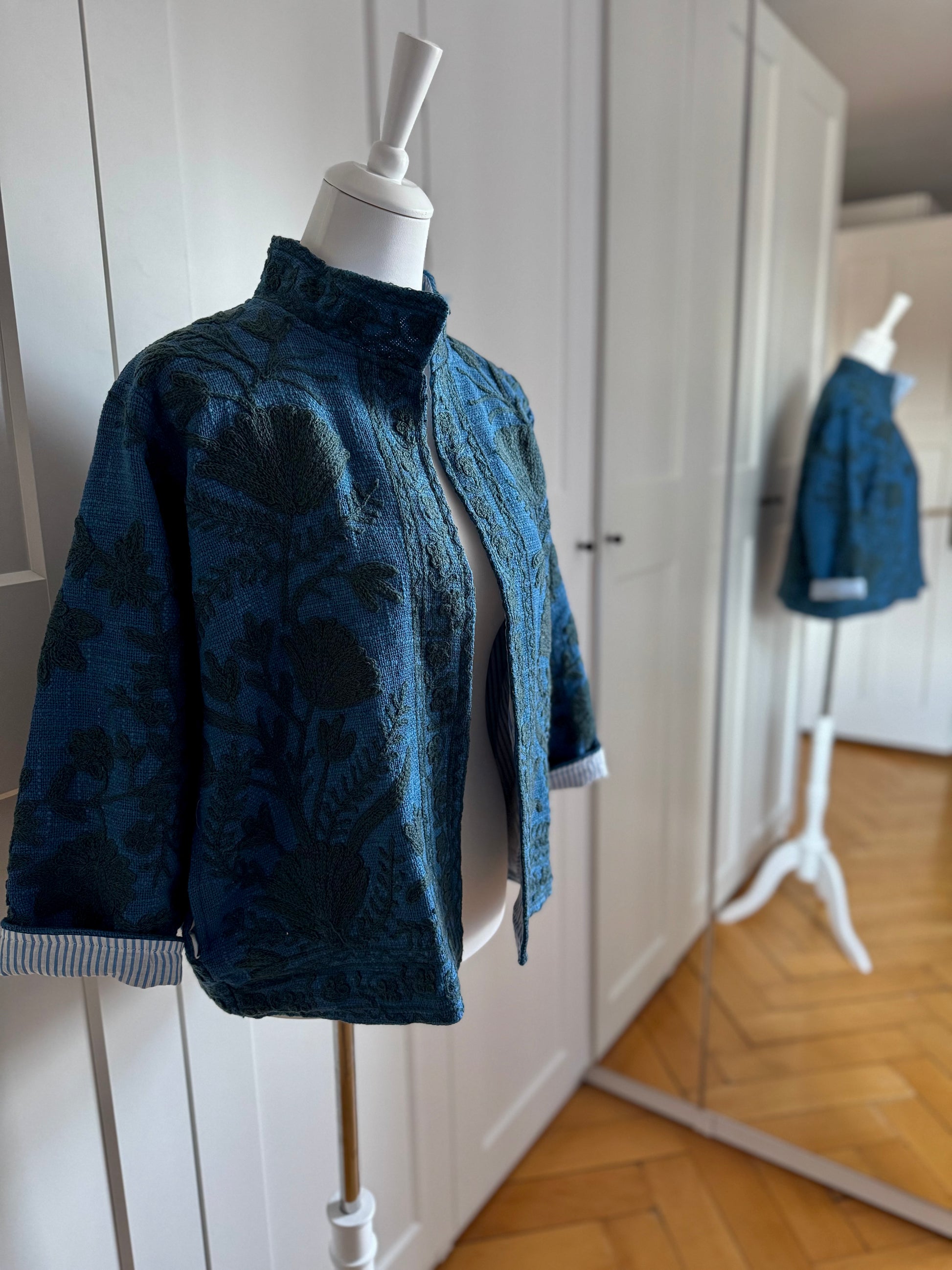 Tiefblauer Stoff, florale Stickerei in Dunkelgrün – diese Jacke erzählt durch Kontrast. Elegant und ruhig, aber mit Wirkung. Von Hand gearbeitet, wie immer, mit viel Liebe zum Detail.