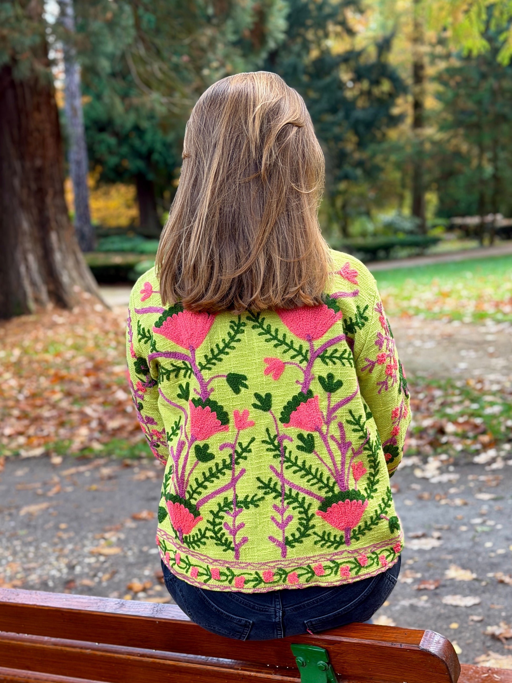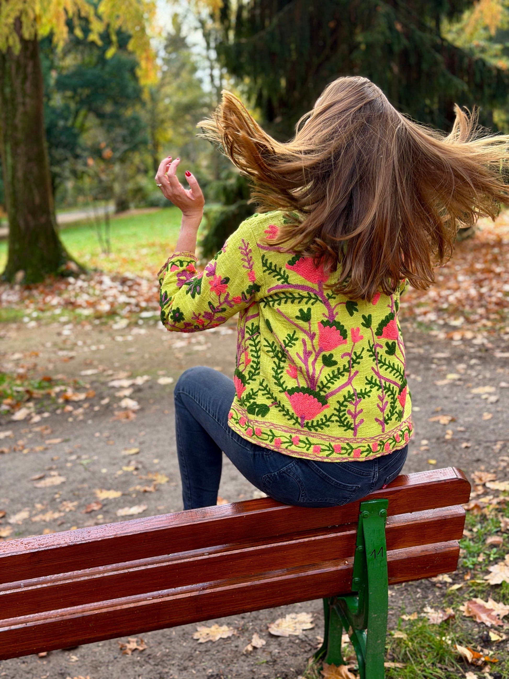 In leuchtendem Zitronengelb und mit floralen Stickereien in kräftigem Pink, dunklem Grün und Lavendel erinnert sie an blühende Zitronenbäume im Sommerlicht. Jedes Detail wurde von Hand gefertigt – jede Blüte ein Unikat.